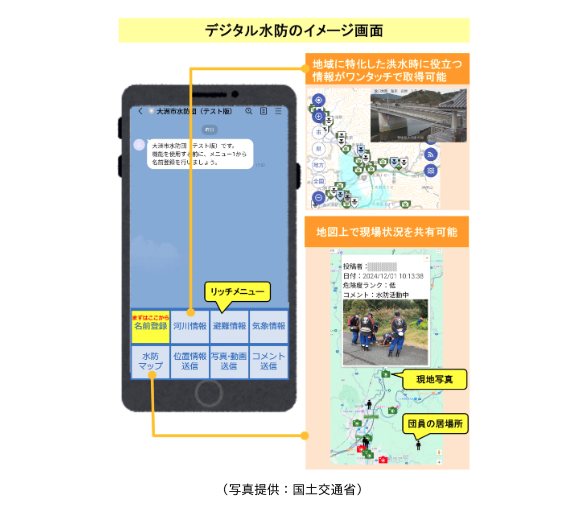 このため、愛媛県大洲市・西予市・内子町の各水防団と国土交通省が連携し、一般財団法人河川情報センターの協力のもと、水防活動時の情報伝達・共有支援ツールである「デジタル水防」を開発し、令和7年(2025年)から実証実験を行っています。デジタル水防は、LINEアプリを活用し、ワンプッシュで当該地域の河川情報や避難情報を取得できたり、団員が撮影した写真や今いる現在地を地図上に簡単に登録できたりするシステムです。今後、他の地域でもこうした機能を活用することを検討しており、洪水などによる被害の防止・軽減に取り組んでいます。