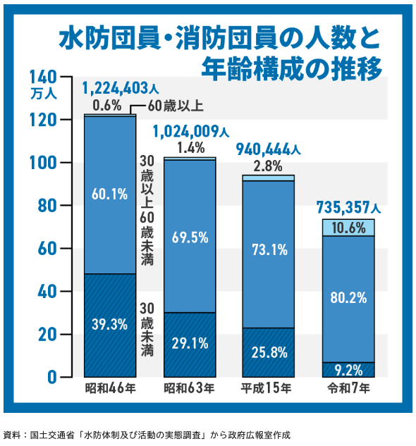 しかし、水防団(消防団)員の数は年々減少しており、水防技術の伝承や地域の防災力の低下が懸念されています。令和7年(2025年)の水防団(消防団)員数は735,357人で、平成15年(2003年)の940,444人から205,087人(21.8%)減少しています。また、団員全体に占める60歳以上の比率は、平成15年(2003年)の2.8%から令和7年(2025年)は10.6%へ上昇し、30歳未満の若い世代の入団が減少するとともに高齢化が進んでいます。