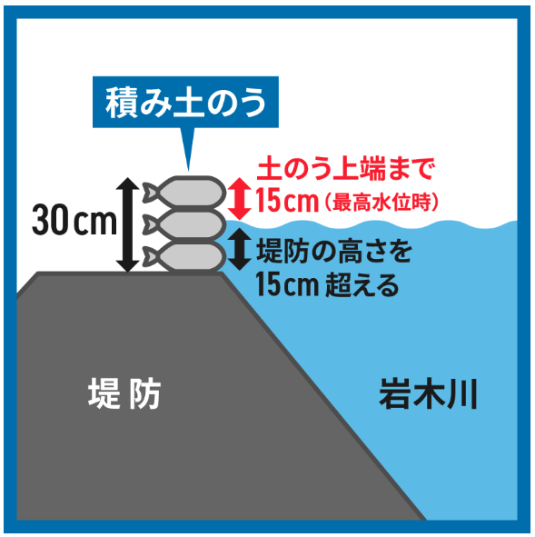 洪水のおそれが生じた際には、水防団は危険箇所のパトロールや立入り制限、住民の避難誘導、水防工法の実施、救助活動などに当たります。例えば、令和4年(2022年)8月3日から東北地方を中心に発生した大雨では、青森県鶴田町の岩木川において、最高水位が一時堤防を超える高さまで達しましたが、地元の水防団が事前に土のうを積み上げたことにより、氾濫を防ぐことができました