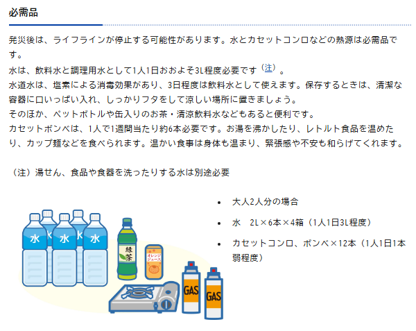 水、カセットコンロは必需品。食品は栄養バランスを考えて1人1週間分の備蓄を
