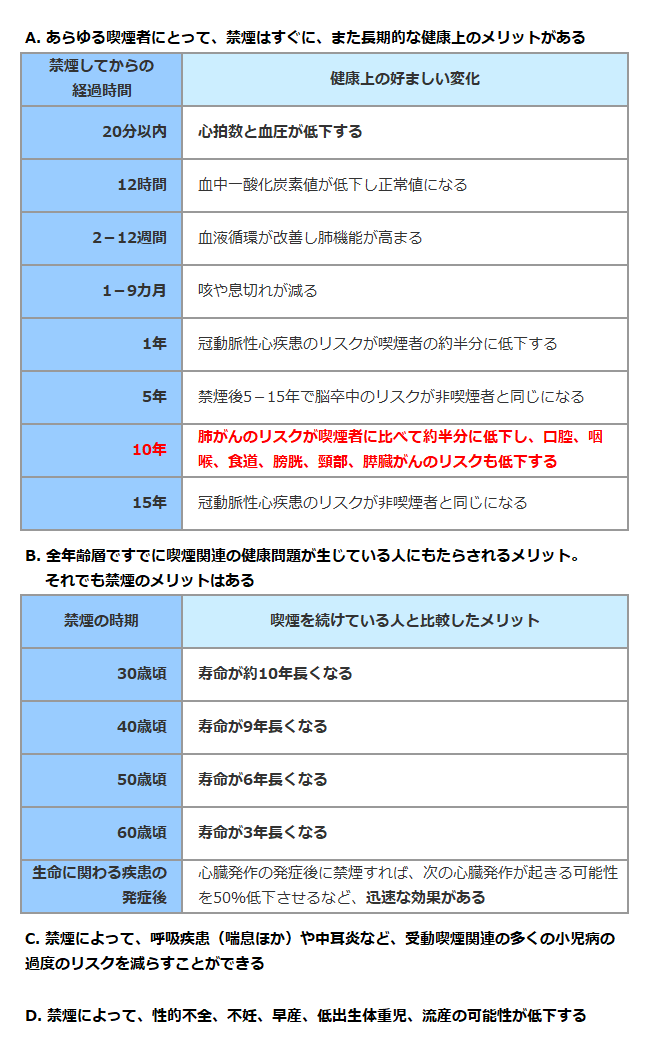がん以外の循環器や呼吸器の病気は、禁煙してから1年程度で大幅にリスクが低下することが示されています。