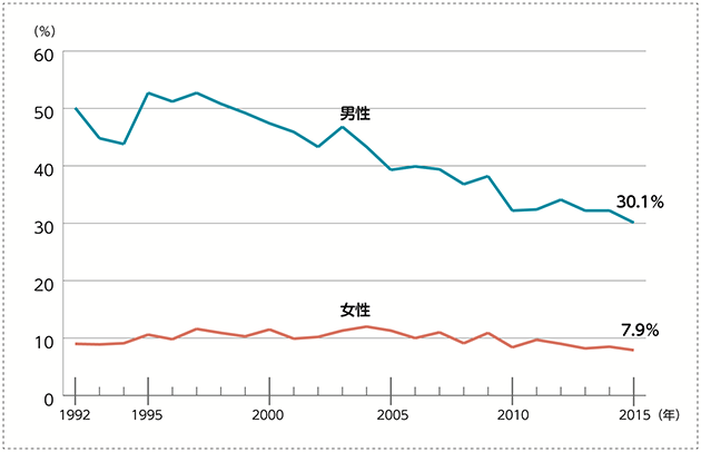 男性の喫煙率は、減少傾向が続き、2015年では30.1%となっています。女性の喫煙率は、10%前後を推移しながら横ばいからやや減少傾向になり、2015年では7.9%です(図1)。
