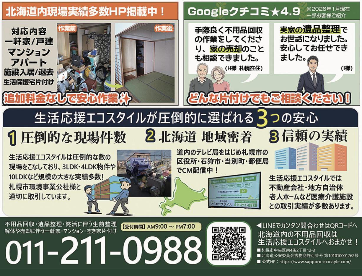 不用品回収・遺品整理・生前整理・一軒家・マンションのお片付けなら「札幌生活応援エコスタイル」にお任せください。札幌市全域・小樽・旭川・函館・帯広・石狩・江別・余市・恵庭などお問い合わせ増加中です!お見積り無料です! ※お見積り時にコープさっぽろ組合員証をご提示いただきますと、 今だけ「遺品整理や家片付け処分等の作業料金から10%割引」「買取金額20%増額」の特典があります。電話番号 :011-211-0988